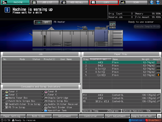 After the [Wake-up] screen, the screen specified in [Default Screen Setting] is displayed. Press the [COPY] tab to display the [COPY] screen, then check that the message [Ready to set reserve job] is displayed.