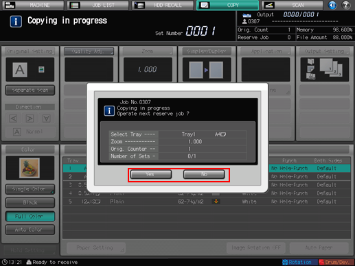 • To return to the [COPY] screen to make another reserve job setting, press [Yes].