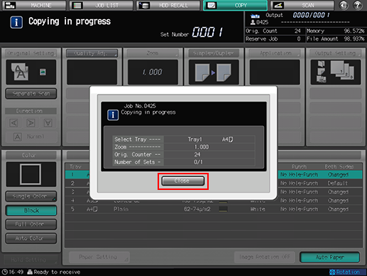 • If you set the [COPY] screen in [Default Screen Setting], only [Close] is displayed on the dialog. To return to the [COPY] screen to make another reserve job setting, press [Close].