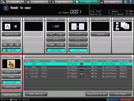 [Auto Color]: Detect whether the scanned original is full color or black-and-white image, and automatically select either [Full Color] or [Black] to copy.