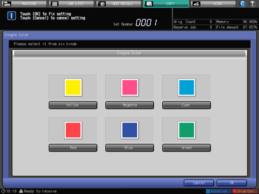 [Single Color]: Copy in a single color selected from 6 colors which are [Yellow], [Magenta], [Cyan], [Red], [Blue], [Green].