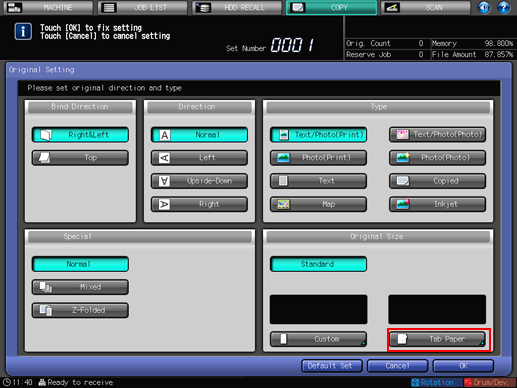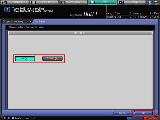 • For copying the tab part, Paper Setting in addition to Original Setting are required. Specify tab paper to the tray in Paper Setting. For details, refer to Paper Setting: Setting Paper for Tray.
