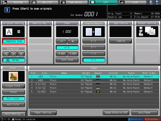 The [Separate Scan] mode is activated. If this key is already highlighted, the [Separate Scan] mode has been activated automatically due to some copy selection.