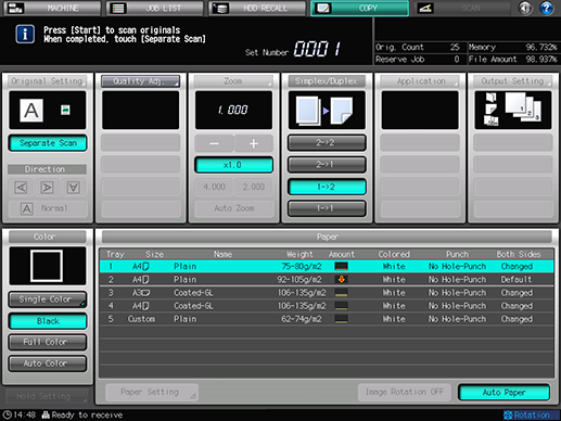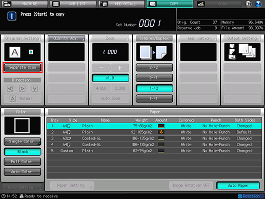 [Separate Scan] mode is necessarily used and operates automatically to make 2-sided copies using original glass.