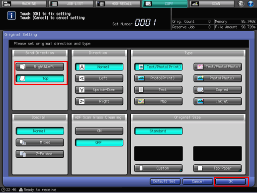 Select a [Direction] button provided under [Original Setting] according to the actual direction of the original.