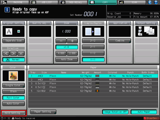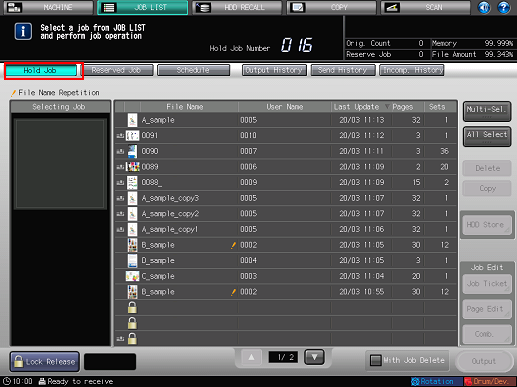 For details about outputting, duplicating, and deleting the hold jobs from the [Hold Job] screen of the [JOB LIST] screen, storing the jobs on the HDD, and also editing the jobs, refer to Hold Job and Save on HDD.