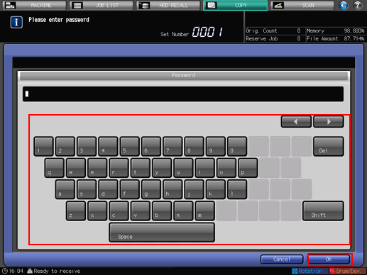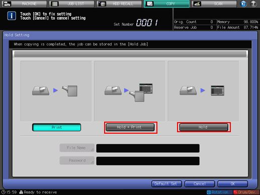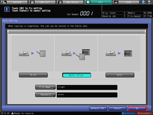 For details about subsequent operations, refer to Hold Job and Save on HDD and Hold Job screen.