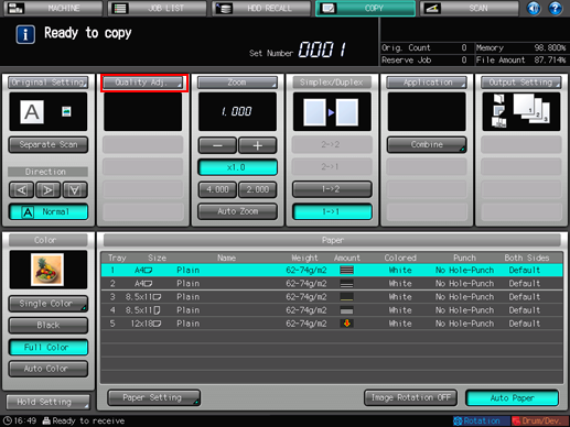 After making the desired adjustment, press [Adj.Proof Copy] on the [Quality Adjustment] screen, [Adj.Proof Copy] on the [Copy Density] screen, or Proof Copy on the control panel. Check the adjustment result with output image.