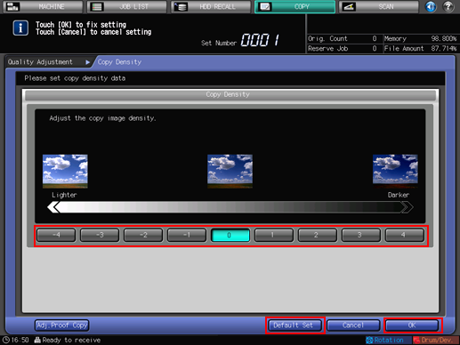 Use [-] and [+] on the right side of [Copy Density] to specify the desired adjustment level. Specify a negative level to make the copy image lighter than the original, or a positive level to make it darker.