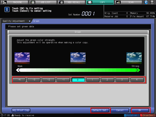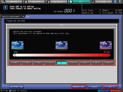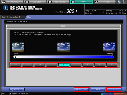 If you press [Default Set] on the [Quality Adjustment] screen, all adjustment items are returned to the standard level.
