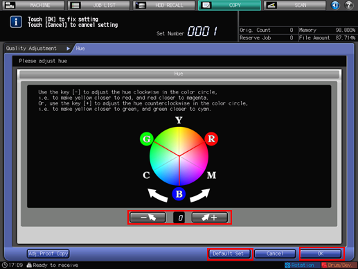 After making the desired adjustment, press [Adj.Proof Copy] on the [Quality Adjustment] screen, [Adj.Proof Copy] on the [Hue] screen, or Proof Copy on the control panel. Check the adjustment result with output image.
