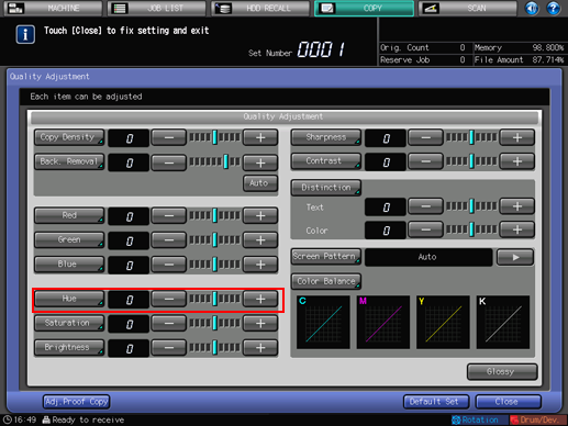 The screen returns to the [COPY] screen. The [Hue] indication can be found under [Quality Adj.] on the [COPY] screen.