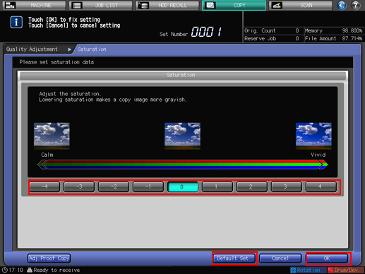 After making the desired adjustment, press [Adj.Proof Copy] on the [Quality Adjustment] screen, [Adj.Proof Copy] on the [Saturation] screen, or Proof Copy on the control panel. Check the adjustment result with output image.