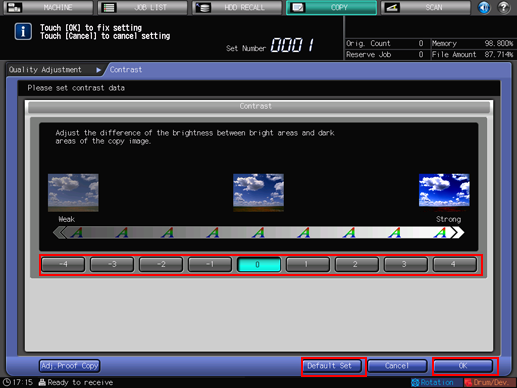 After making the desired adjustment, press [Adj.Proof Copy] on the [Quality Adjustment] screen, [Adj.Proof Copy] on the [Contrast] screen, or Proof Copy on the control panel. Check the adjustment result with output image.