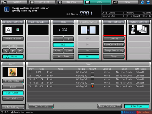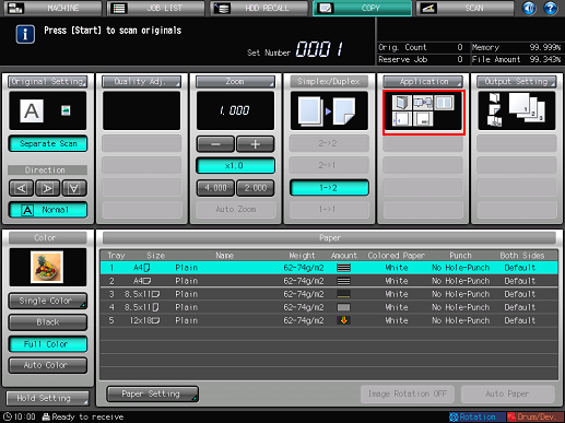 Up to 4 shortcut keys for frequently-used application settings can be displayed under [Application] on the [COPY] screen. These keys allow you to set the application function at a single touch, or to directly jump to the setting screen for each. The setting of shortcut keys can be made from [User Setting] in UTILITY.