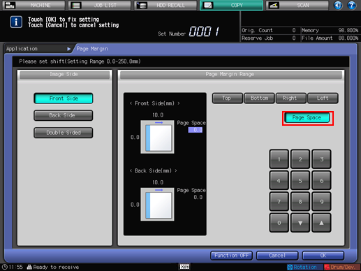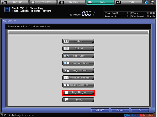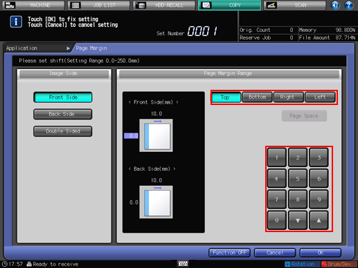 To resume the original settings, press [Cancel]. To cancel the [Page Margin] function with the current setting saved, press [Function OFF].