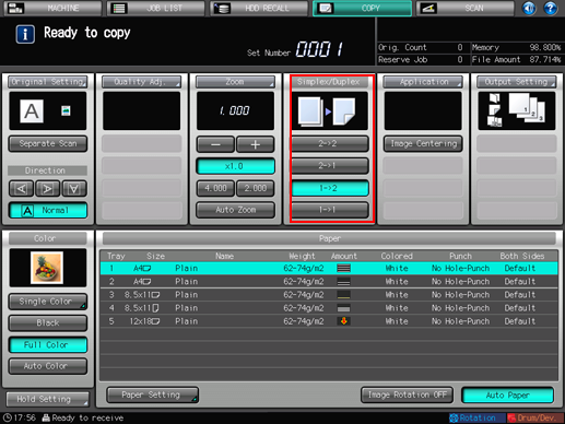 Display the [COPY] screen and press the desired button under [Simplex/Duplex].