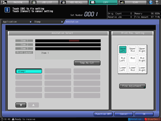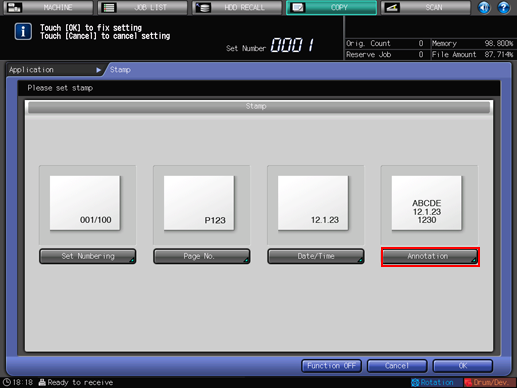 This function allows you to recall a predefined combination of text, date/time to load the original, and annotation number of the original and to print them onto output copies at the designated location. The annotation number can be changed temporarily on the Annotation screen after recalling the predefined setting ([Temp.No.Set]).