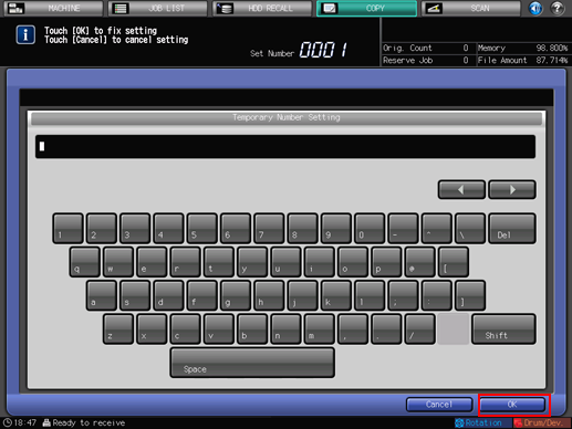 Press the screen keys to enter a desired number for the temporary number. Up to 12 one-byte characters can be entered. With this setting specified, the annotation number will not be counted in the former setting. The entered temporary number will be printed on all pages.