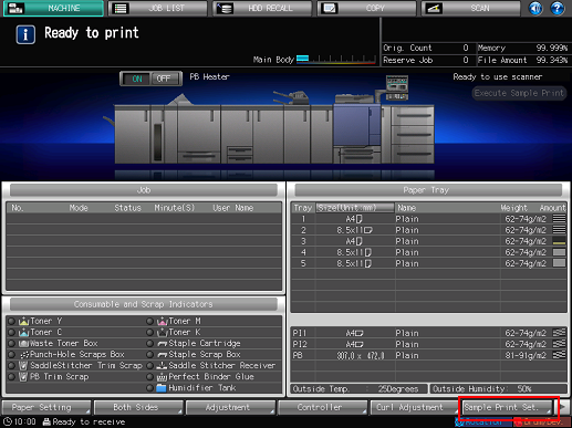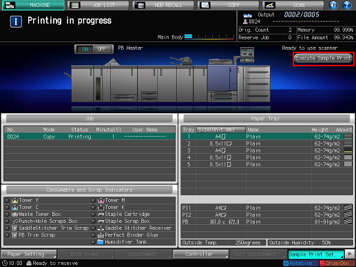 The [Execute Sample Print] button is displayed on the [MACHINE] screen while printing is in progress. Press the key at the desired moment to output the same image as that currently printed to the secondary tray, so that you can check the quality of printed image at that time.