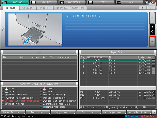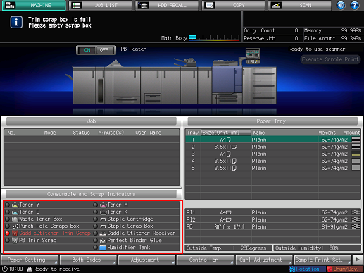 Press the [Saddle Stitcher Trim Scrap] indicator in the Consumable and Scrap Indicators area of the [MACHINE] screen.