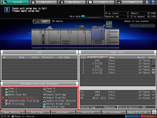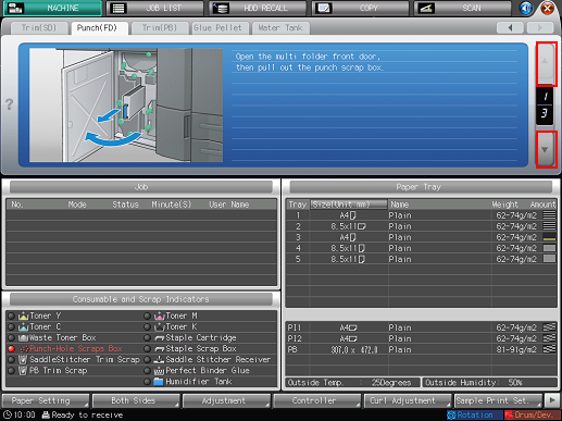 Press the [Punch-Hole Scraps Box] indicator in the Consumable and Scrap Indicators area of the [MACHINE] screen.