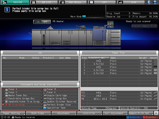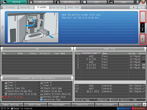 The [PB Trim Scrap] indicator lights in red in the Consumable and Scrap Indicators area of the [MACHINE] screen.