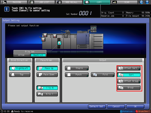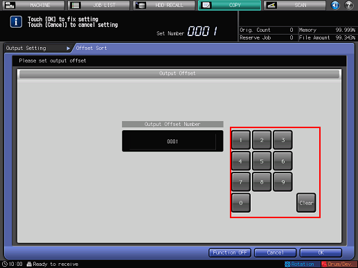 Selecting [Offset Sort] or [Offset Group] displays the [Output Offset] setting screen. Use the touch panel keypad to enter the desired number of sets to be offset. Available range is from 1 to 9,999. When finished with the entry, press [OK].