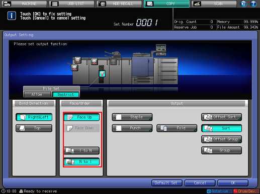 Select either [Face Up] or [Face Down], and either [1 to N] or [N to 1] provided under [Face/Order], as needed.