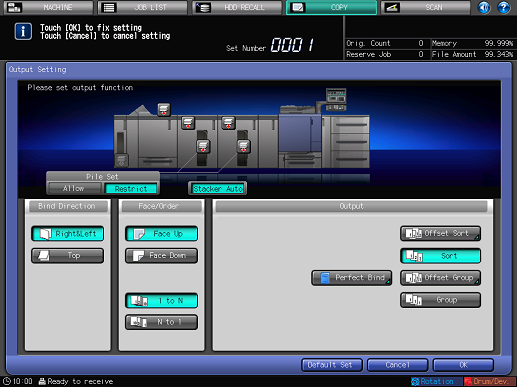 If the machine has two units of Large Capacity Stacker LS-505 mounted, [Stacker Auto] is displayed on the [Output Setting] screen. With [Stacker Auto] pressed, the machine delivers output sheets as follows (supposing the one on the right side of the two large capacity stackers as stacker 1, and the other on the left side as stacker 2):