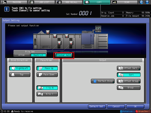 The Stacker Auto function operates as mentioned above only when both stacker 1 and stacker 2 are free from trouble, when no paper remains in the stacker 2, and when [Allow] is selected for Pile Set function.