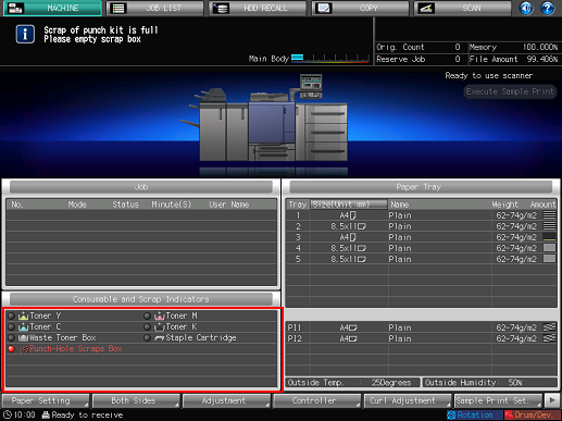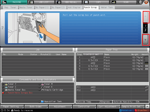 Press the [Punch-Hole Scraps Box] indicator in the Consumable and Scrap Indicators area of the [MACHINE] screen.