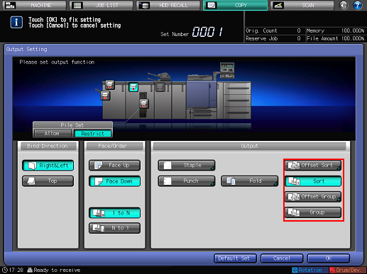 A machine mounted with Finisher FS-532 is initially set to output sorted sets to the primary (main) tray, regardless of whether or not to be mounted with other options.