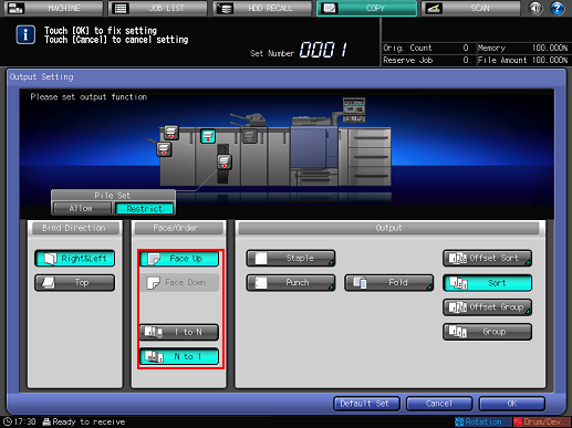 Select either [Face Up] or [Face Down], and either [1 to N] or [N to 1] provided under [Face/Order], as needed.