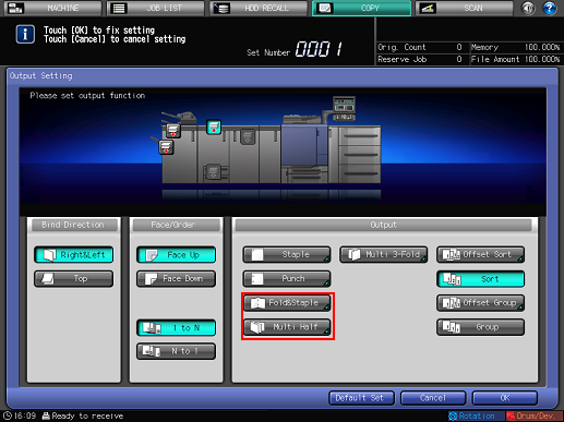 Select [Fold&Staple] or [Multi Half] under [Output].