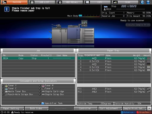 At this time, the message [Staple finisher sub tray is full / Please remove paper] appears in the message area of the screen, and the Start LED turns orange. The machine does not resume printing even if you press Start on the control panel.