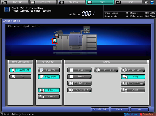 A machine mounted with Finisher FS-612 is initially set to output sorted sets to the primary (main) tray, regardless of whether or not to be equipped with other options. Follow the procedure below to change the output tray and select the desired output mode.