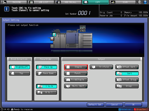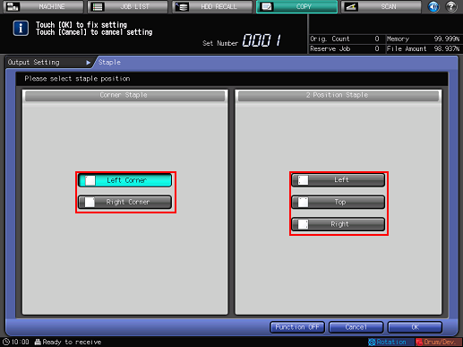 Copies are stapled in this mode. Select one of the following five types of the staple position.