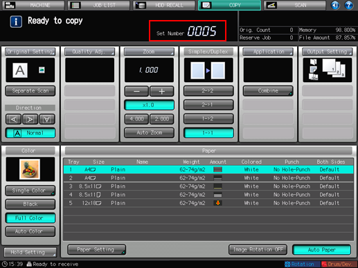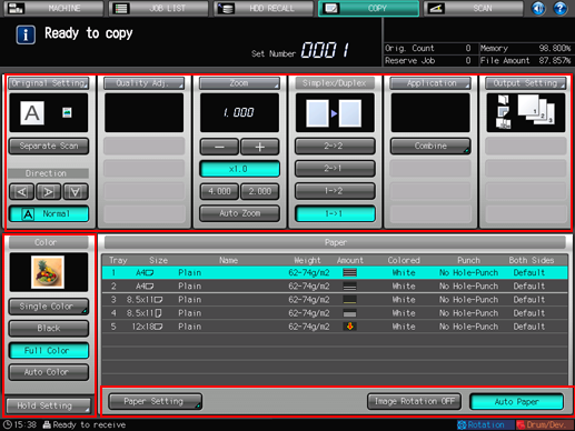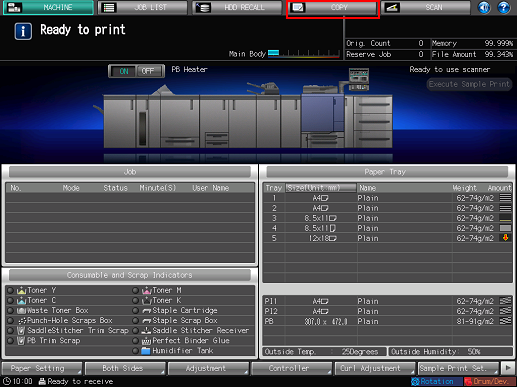 The [MACHINE] screen shows up first at the default setting. To display the [COPY] screen, press the [COPY] tab on the [MACHINE] screen.