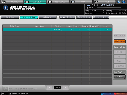 You can change the operation order of reserved jobs or cancel reserved jobs in the [JOB LIST] screen. For details, refer to Overview of the JOB LIST Screen.