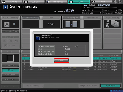 If you set the [COPY] screen in [Default Screen Setting], only [Close] is displayed on the dialog. To return to the [COPY] screen, press [Close].