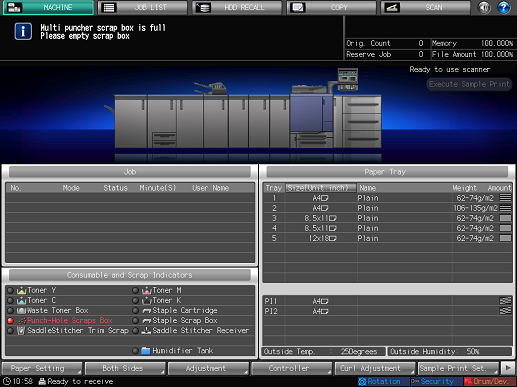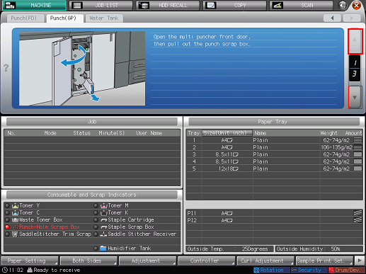 1. Press the Punch-Hole Scraps Box indicator in the Consumable and Scrap Indicators area of the [MACHINE] screen.