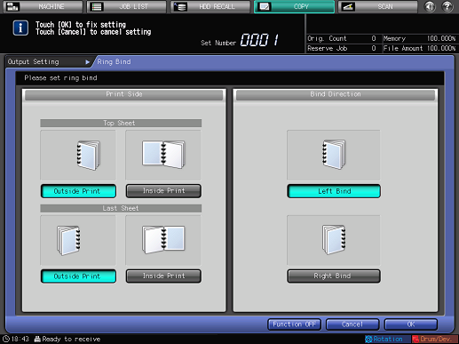 Select the bind direction ([Left Bind] or [Right Bind]) for the booklet. This selection is effective only for the portrait original, while the setting is fixed to the top binding for the landscape original.