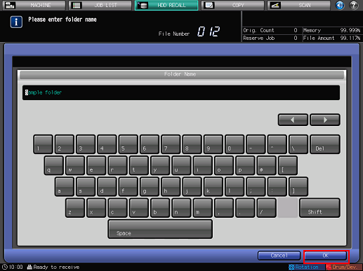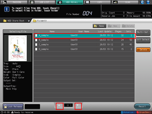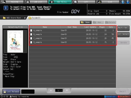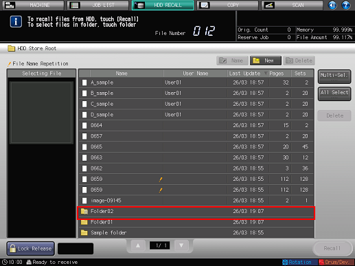 When recalling a job stored in another folder provided on the [HDD Store Root] screen, press that folder. The contents of selected folder will be listed on the screen.