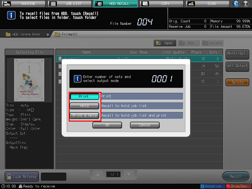 When recalling a job stored on the HDD, select the desired operation from [Print], [Hold], and [Print & Hold].