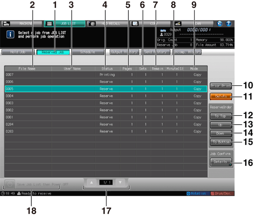 10 | [Prior Print] | Outputs a job to be printed prior to the job in progress. Select the job that you want to print prior to the job in progress, press [Prior Print], then press [Yes] on the dialog. |