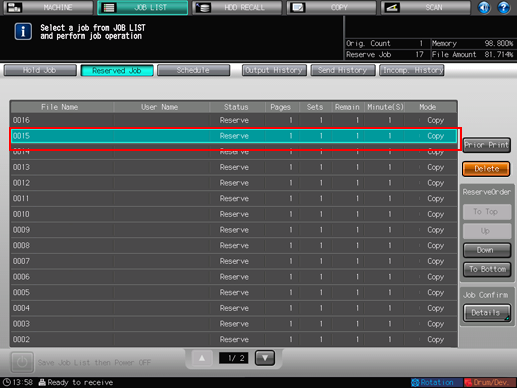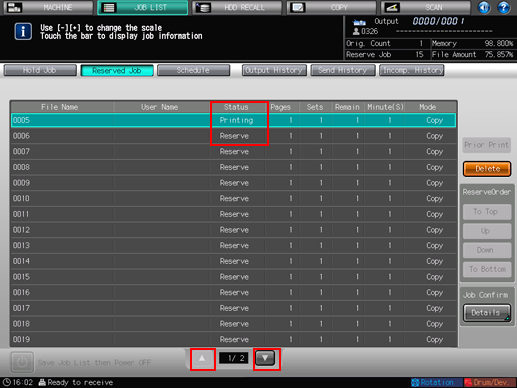 For reserved jobs, you can delete the job or change the printing order on this screen, and also check details on the [Ticket Details] screen.