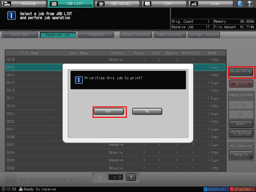 To perform Prior Print, select the job that you want to print prior to the job in progress, then press [Prior Print]. Press [Yes] on the dialog.
