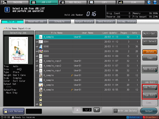 Job Ticket Edit | Allows you to check the Basic Setting, Output Setting, Application Setting, Paper Setting, and Quality Adjustment of a hold job or job stored on the HDD, and also to partially change them for output. |