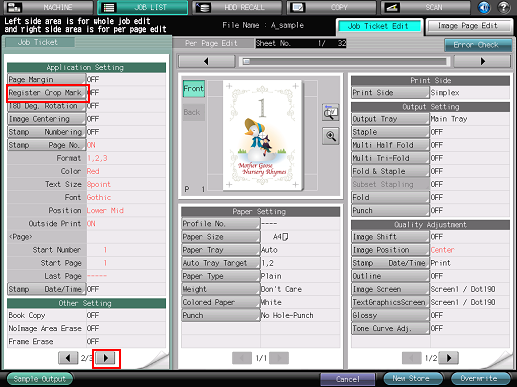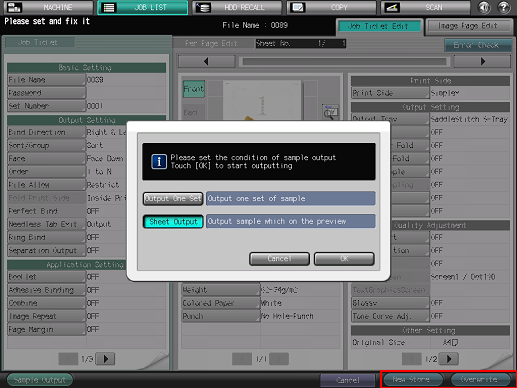 Press [Sample Output] to output a sample set or a sheet of preview image, in order to check the print result of the setting.